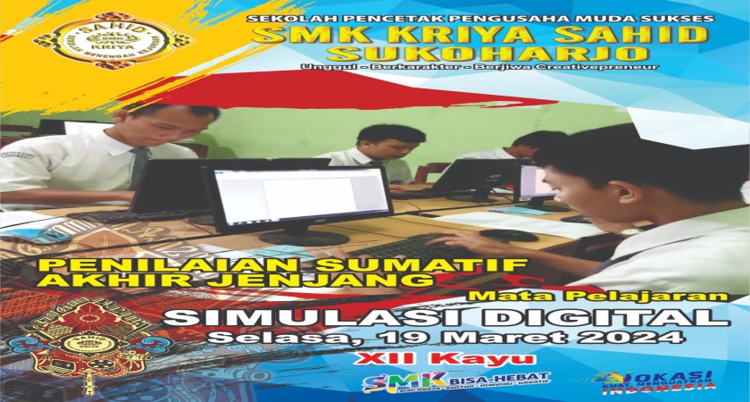 SMK Kriya Sahid Sukoharjo melaksanakan kegiatan Penilaian Sumatif Akhir Jenjang (PSAJ) dimulai dari tanggal 18 Maret sampai tanggal 27 Maret 2024., dan diikuti oleh seluruh peserta didik kelas XII yang berjumlah 50 siswa. dari 4 Kompetensi Keahlian ( Kriya Kreatif Kayu dan Rotan, Kriya Kreatif Batik dan Tekstil, Multimedia, Tehnik Komputer dan Jaringan).